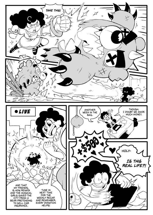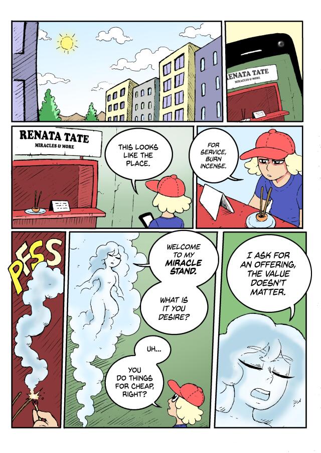 Once a beloved goddess, Renata is now stuck selling miracles to make ends meet... and her clients are anything but grateful. With a team of eccentric magical girls by her side, she tackles absurd requests, battles monsters, and faces off against sinister forces threatening her world. But reclaiming her godhood won’t be easy when pop culture slander, rival magical merch, and her own chaotic past keep getting in the way. Divine power meets mortal hustle in this fast-paced, comedic adventure where every miracle comes at a price!