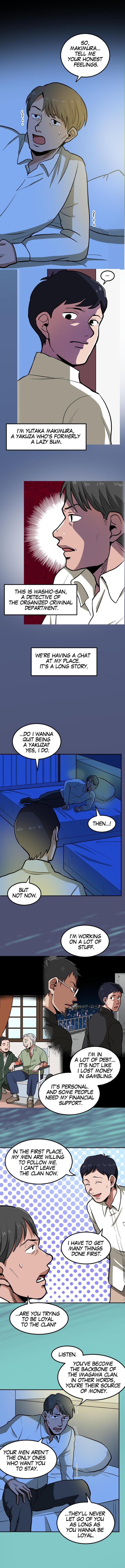 This is a story about a man who was once an unemployed lazy bum living with his parents, but kicked out of his home to find work. He ends up unwittingly getting a job at a front company for the yakuza and begins to climb the ranks in their organization.